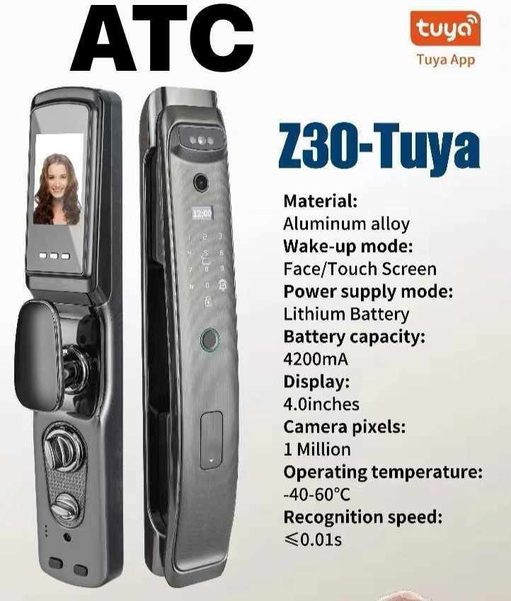 Upgrade your home security with the ATC Z30 Tuya Smart Door Lock, featuring advanced face recognition, a 4-inch display, and seamless control via the Tuya Smart app. Designed with a durable aluminum alloy body, this smart lock offers ultra-fast unlocking (≤0.01s), multiple access methods, and reliable performance even in extreme temperatures. Perfect for modern homes, offices, and apartments.